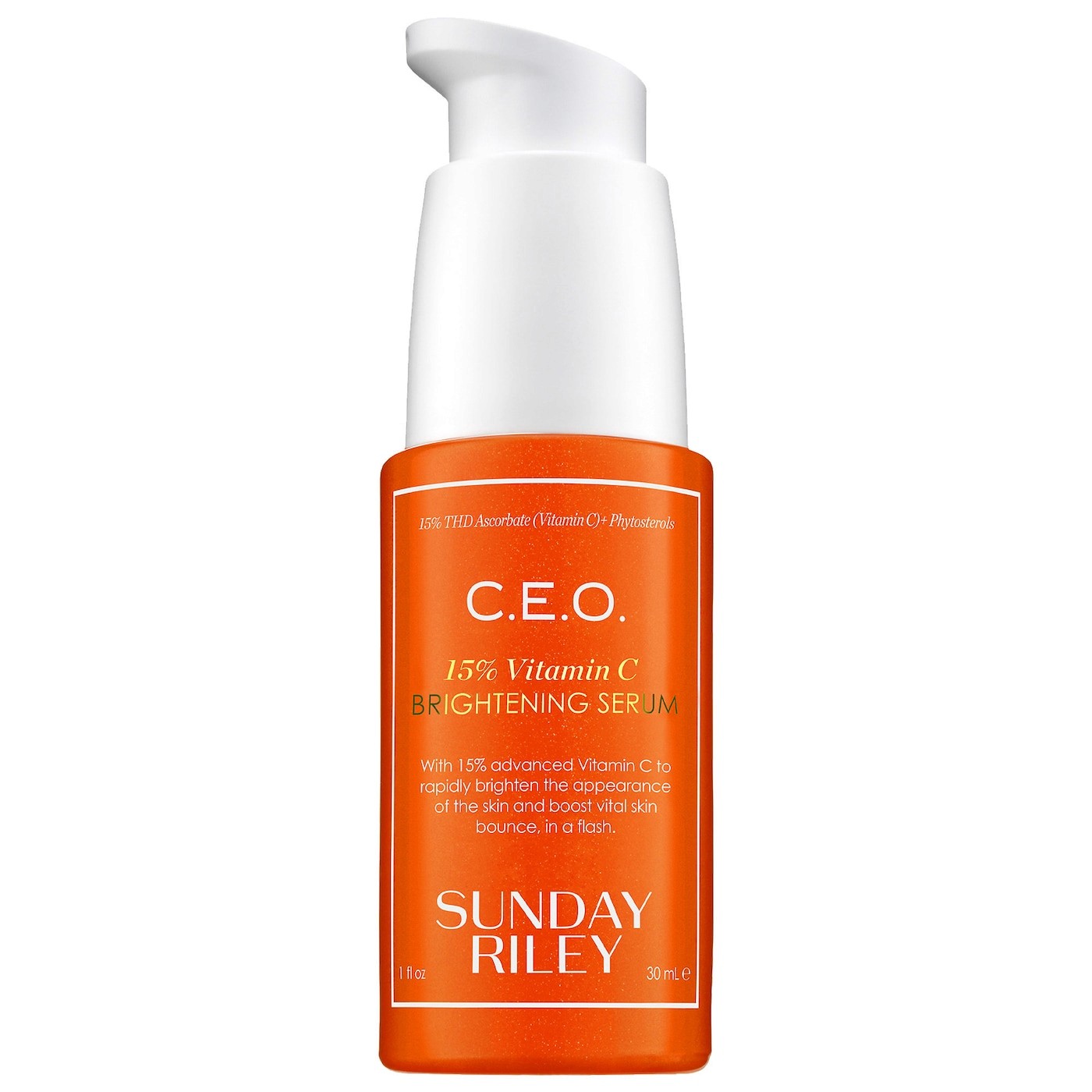 Sunday Riley's C.E.O. 15% Vitamin C Brightening Serum is a potent antioxidant treatment featuring a high concentration of THD ascorbate (a stable vitamin C derivative) with squalane and phytosterols, designed to brighten, even skin tone, and address early signs of aging. Fragranced with citrus essential oils.
