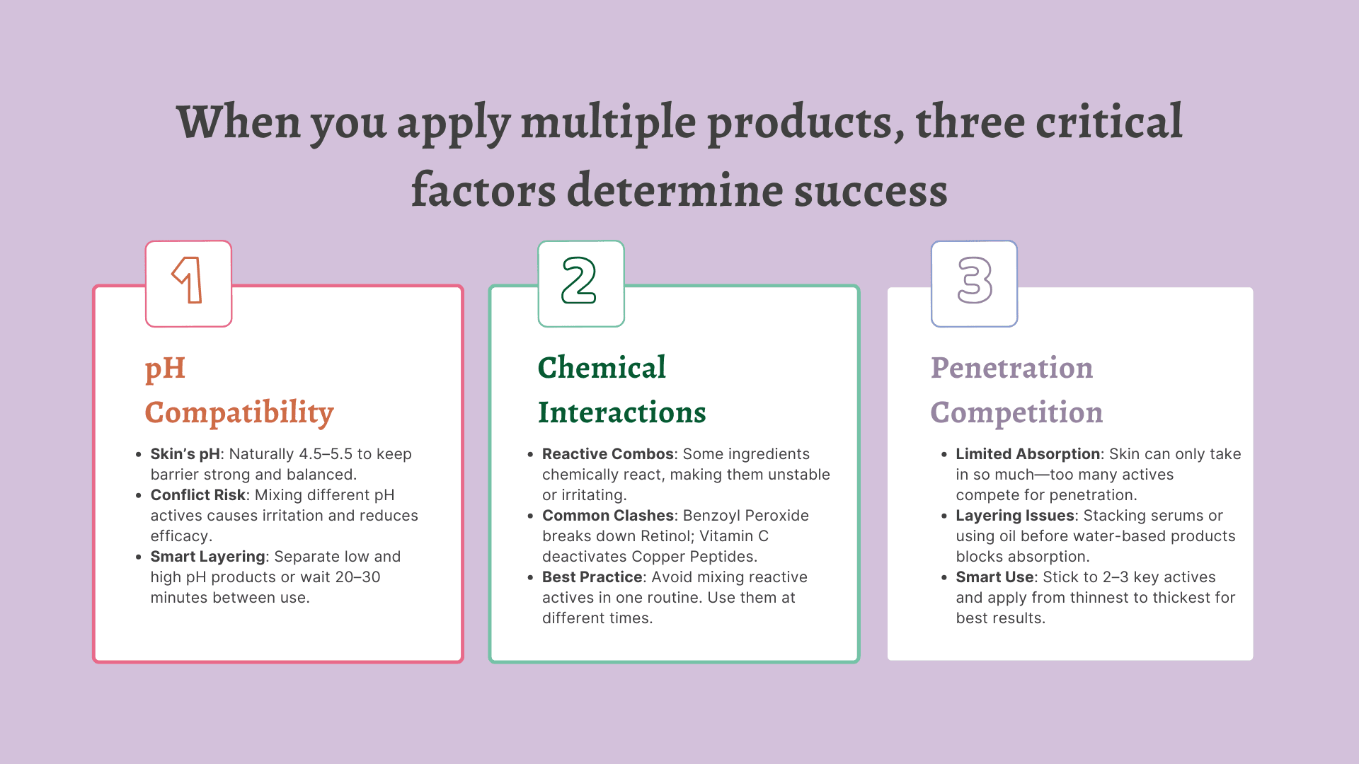 Your skin can only absorb so much at once. When you layer multiple active ingredients, they compete for penetration, leading to: